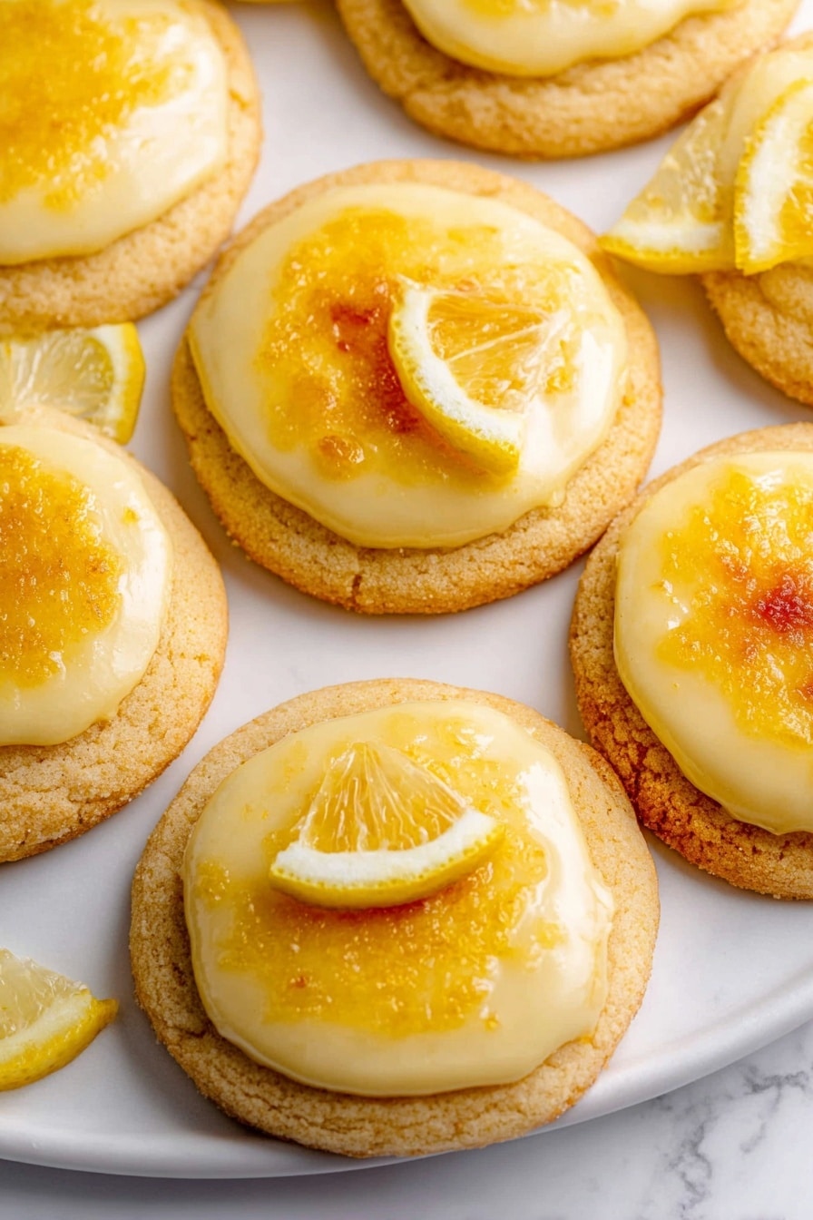 Fill a piping bag fitted with a small round tip with your chilled lemon pastry cream. Pipe a generous dollop onto the top of each cooled cookie. Now comes the fun part: sprinkle about a teaspoon of sugar on top of the cream and grab your kitchen torch. Carefully brûlée the sugar until it bubbles and caramelizes into that golden brown, crackly crust we all love. Make sure not to torch too long or you’ll end up melting the creamy layer underneath!