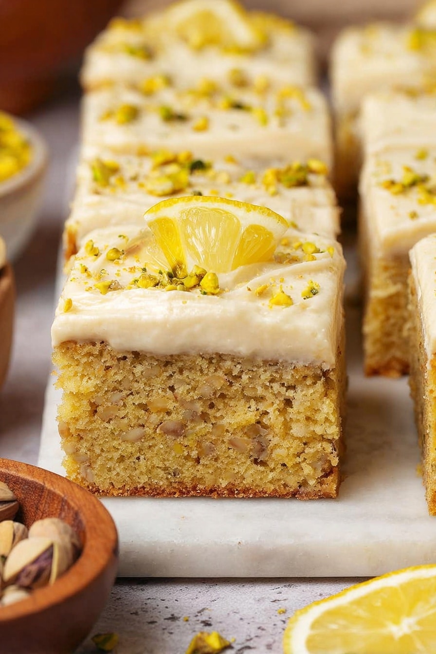 Once cooled, carefully slice off a thin layer from the top of the cake—this helps the soak seep in evenly. Transfer it to a serving plate, then poke lots of little holes (I use the handle of a wooden honey dipper for tiny holes) so the pistachio milk soak can melt right in. Pour the soak slowly over the cake and be patient as it absorbs. Finally, frost the top generously with the lemon pistachio cream cheese frosting and, if you’re using lemon curd, swirl a little on top with a spoon’s back. Cut into 16 slices and get ready for your taste buds to dance!