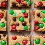 Delight in these Loaded Christmas Cookie Bars, a festive treat packed with creamy peanut butter, holiday-themed M&Ms, and chocolate chips. These bars combine a soft, chewy texture with the perfect balance of sweet and salty, topped with a sprinkle of flaky sea salt for an extra touch of indulgence. Ideal for holiday gatherings or cozy winter snacking.