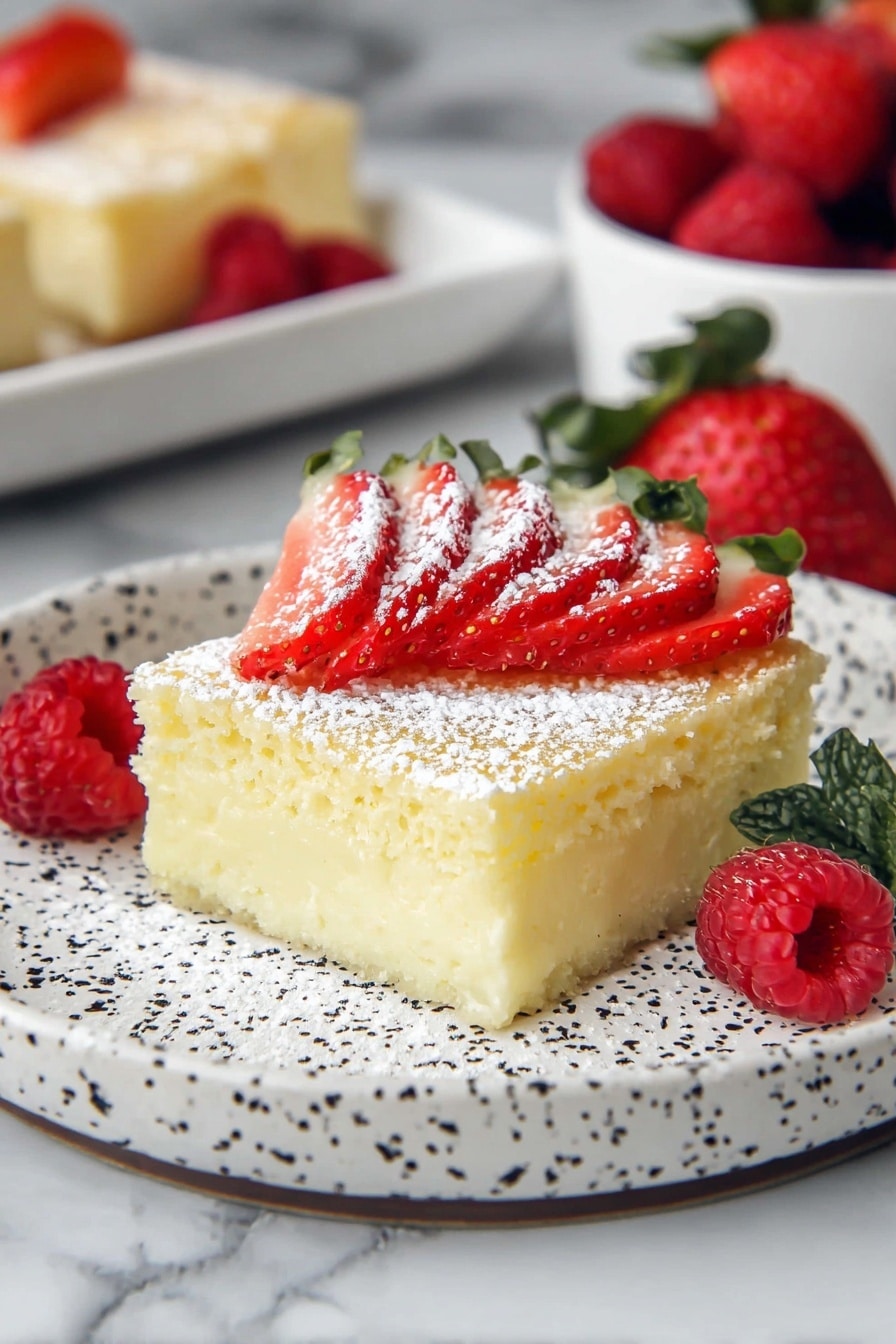 Once out of the oven, let the cake cool before dusting it with powdered sugar. This adds a subtle sweetness and makes it look picture-perfect. I cut it into squares and watch as everyone grabs a piece — usually faster than I expect!