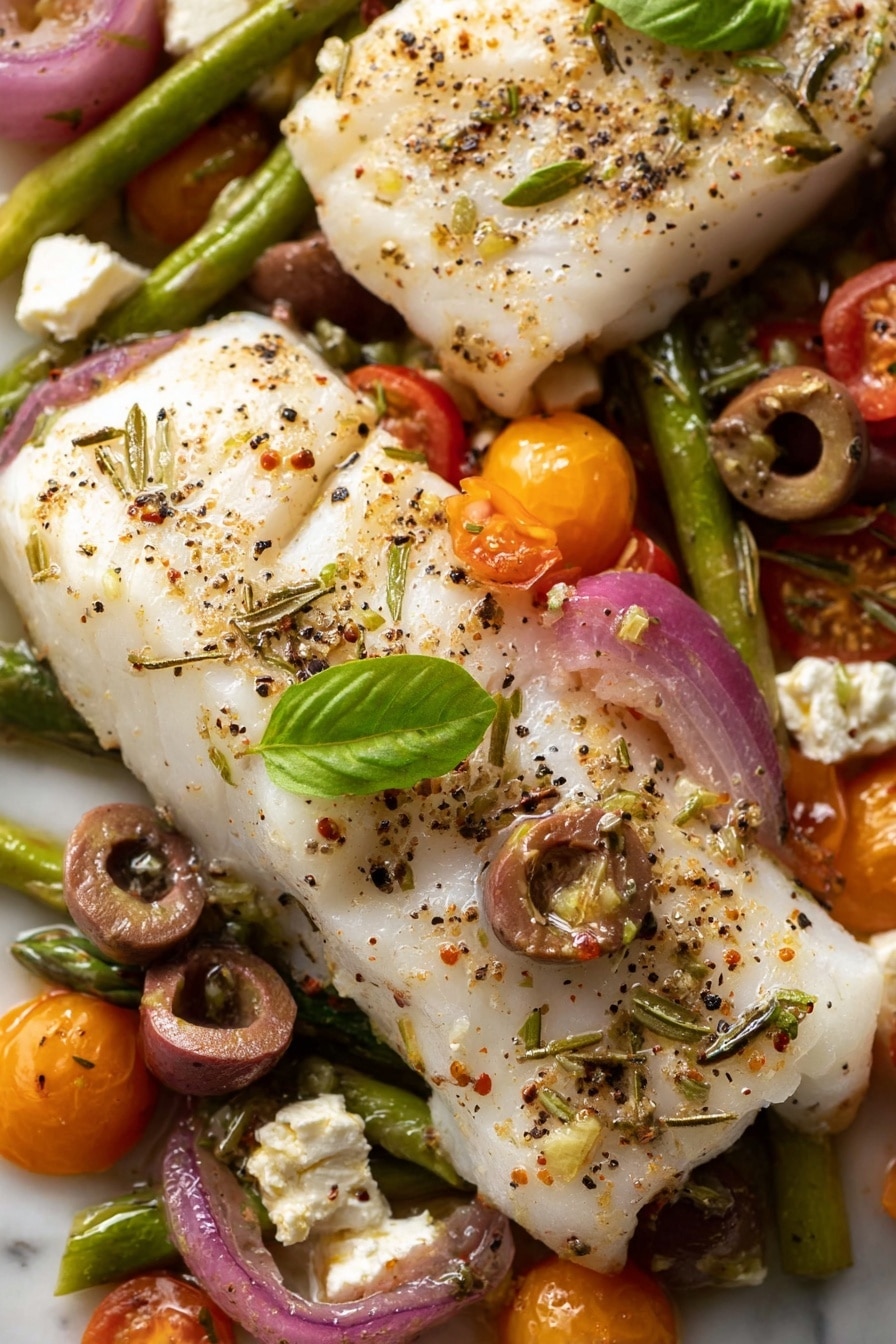 This Mediterranean Cod recipe features tender cod filets baked alongside a medley of fresh vegetables, seasoned with a flavorful Greek Mediterranean blend, olives, feta cheese, and fresh basil. It’s a light, healthy, and vibrant dish perfect for a wholesome dinner.