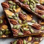 The image shows several pieces of broken chocolate bark with three main layers: a bottom layer of light caramel color with a smooth texture, a middle thick layer of rich dark chocolate that looks slightly shiny and creamy, and a top layer covered with scattered pecan halves, green pumpkin seeds, and oval peanut butter pieces that have a creamy surface with a light dusting of cinnamon. The pieces are placed closely on a white marbled surface, creating a mix of rough and smooth textures with warm brown and green colors. photo taken with an iphone --ar 2:3 --v 7 - Milk Chocolate Pumpkin Buttercrunch, Pumpkin Buttercrunch Recipe, Fall Candy Recipes, Easy Holiday Treats, Pumpkin Chocolate Snack