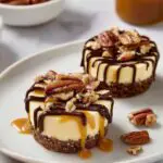 - Add Toppings and Serve: Before serving, drizzle each mini cheesecake with caramel sauce and melted semi-sweet chocolate. Optionally, sprinkle additional pecans on top for extra crunch and flavor.