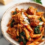 I love tweaking this No-Boil Baked Penne with Meatballs Recipe depending on the season and what I have on hand. Feel free to make it your own, whether that means switching up proteins or adding in extra veggies.