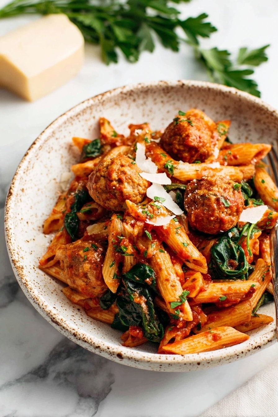 This No-Boil Baked Penne with Meatballs recipe is a delicious and easy one-dish meal perfect for busy weeknights. Combining whole wheat penne, fire-roasted tomatoes, milk, butter, garlic, and your choice of meatballs or shredded chicken, this hearty casserole bakes directly in the oven without the need to pre-cook the pasta. Finished with fresh spinach and Parmesan under the broiler, it’s a comforting and flavorful Italian-inspired dinner that serves six.