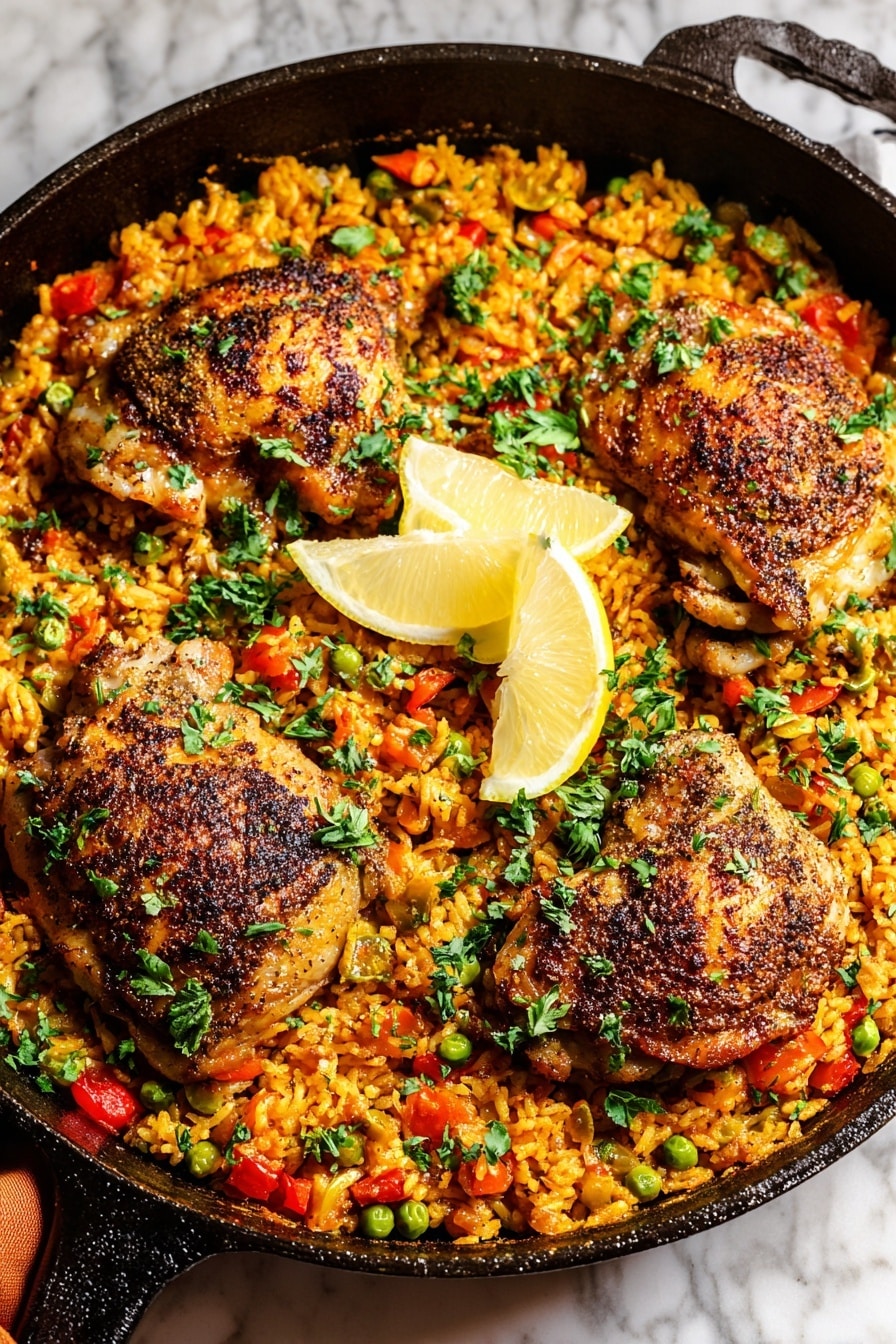 A black cast iron pan filled with three golden-brown cooked chicken thighs sitting on top of a bed of orange-yellow cooked rice mixed with small pieces of red and green bell peppers, peas, and onions. The chicken thighs have a crispy texture with specks of black seasoning and are sprinkled with chopped fresh green herbs. Two lemon wedges are placed in the center on top of the rice. The pan is on a white marbled surface. photo taken with an iphone --ar 2:3 --v 7 - One-Pan Spanish Chicken and Rice, Spanish chicken and rice, easy Spanish chicken dish, flavorful chicken and rice skillet, weeknight Spanish chicken