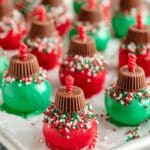 - Decorate: Transfer each coated truffle to the parchment paper. Immediately top each with an upside-down miniature Reese’s Cup and sprinkle with Christmas sprinkles.