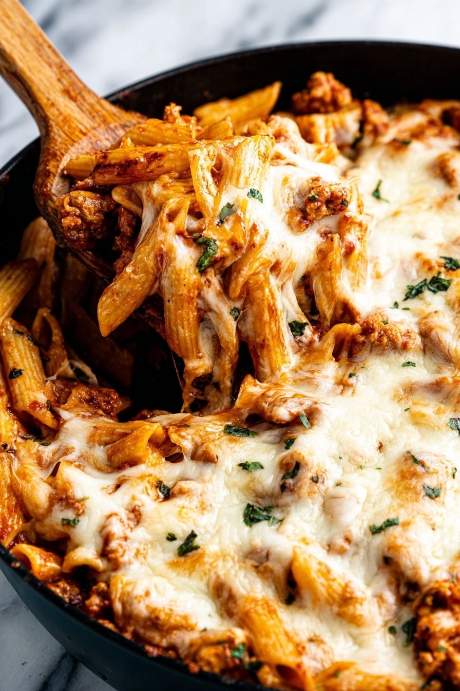Drain the pasta once it’s done, then add it directly to the pan with the chicken and sauce mixture. Stir so every strand or piece gets coated in the saucy goodness. Sprinkle the mozzarella or Italian blend cheese on top and turn off the heat. The residual warmth will melt the cheese perfectly. If you’re feeling fancy, I sometimes pop the entire pan briefly under the broiler until the cheese bubbles and browns just a bit—super comforting and impressive!