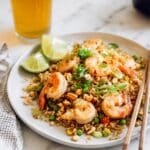 - Serve and Garnish: Serve the curry shrimp fried rice immediately. Optionally garnish with sliced scallions, chopped cashews, cilantro, and lime wedges for added freshness and texture.