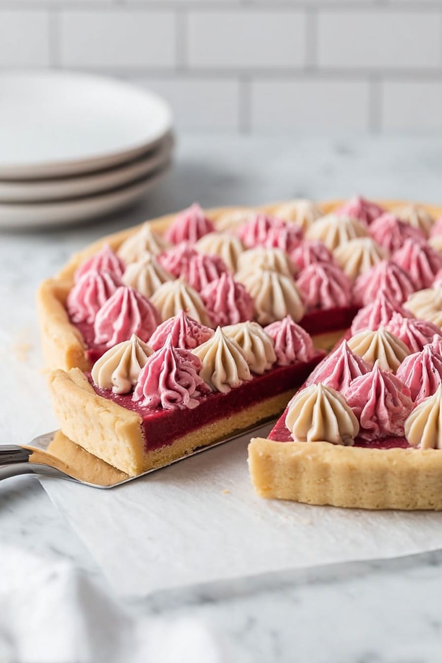 A round tart with a thick, golden crust forms the base, topped with a smooth, deep red filling spread evenly. On top, there are two colors of piped cream dollops: a bright pink and a light beige, arranged closely together in small, pointed swirls covering the entire surface. A single slice of the tart is being lifted with a metal spatula, showing the crust's thickness and the layers clearly. The tart sits on white parchment paper on a white marbled surface, with a soft, out-of-focus white tiled background and some stacked white plates nearby. photo taken with an iphone --ar 2:3 --v 7 - Raspberry Sugar Cookie Cake, raspberry cookie cake, raspberry dessert, sugar cookie cake, raspberry buttercream cake