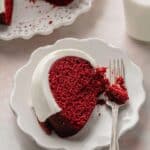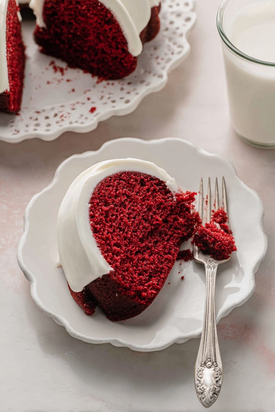 A soft slice of red velvet cake with one visible layer of deep red, moist sponge topped with a smooth, thick layer of white cream frosting. The slice rests on a white plate with a scalloped edge, showing a small piece cut out and held by a silver fork with detailed handle on the right side. In the background, there is another piece of red velvet cake on a similar white scalloped plate and a round glass filled with white milk, all placed on a white marbled surface. Photo taken with an iphone --ar 2:3 --v 7 - Red Velvet Bundt Cake with Cream Cheese Glaze, moist red velvet cake, easy Bundt cake recipe, festive holiday dessert, cream cheese glaze dessert