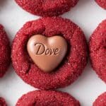 - Add Chocolate Hearts to Cookies: Remove the cookies from the oven and immediately press one frozen Dove Chocolate Heart into the center of each cookie, allowing it to melt slightly into the warm dough.