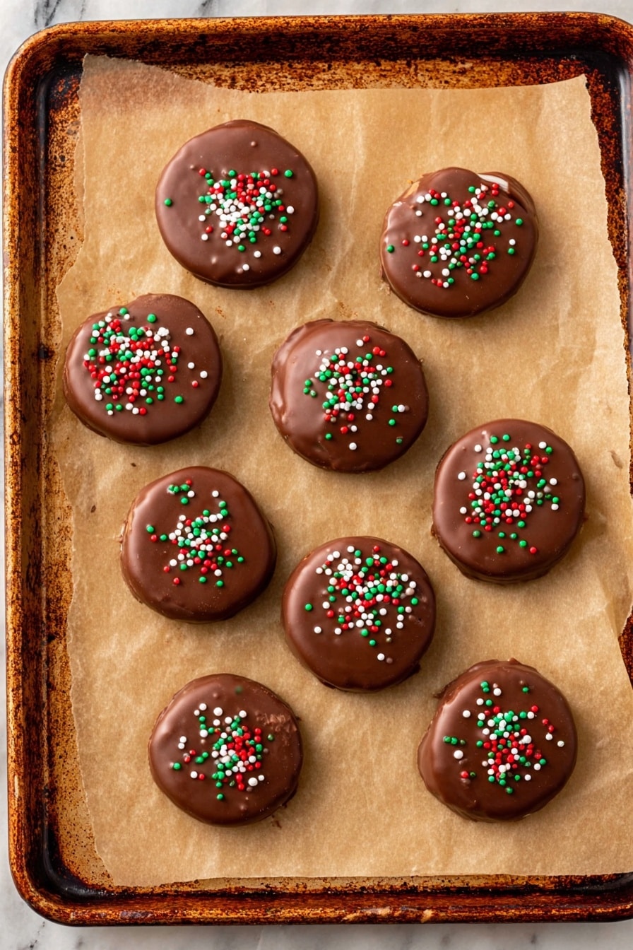 - Dip sandwiches in chocolate: Using two forks, dip each sandwich into the melted chocolate, allowing excess to drip off. Scrape the bottom of the sandwich to prevent pooling chocolate, then place on parchment paper and sprinkle with holiday sprinkles for decoration.