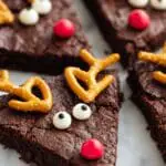 - Add Pretzel Antlers: Spread a little melted chocolate onto the bottoms of two pretzel twists per brownie slice. Affix these to the top corners of each slice to create the reindeer’s antlers.