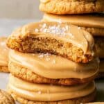 While the cookies cool, whisk together powdered sugar, salted caramel, and milk or cream until smooth. Adjust the liquid to get the glaze just spreadable—not too runny, not too stiff. Once cookies are cooled and firm, spread glaze evenly on top. I like to let mine set for 30 to 45 minutes, then sprinkle with flaky salt for a final burst of flavor. This step takes these cookies over the top, trust me!