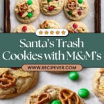 Santa’s Trash Cookies are a delightful and colorful treat, featuring a mix of sweet and salty ingredients like M&M’s, peanut butter chips, potato chips, and broken pretzels. These cookies offer a perfect balance of flavors and textures, with a golden brown exterior and a slightly glossy, chewy inside. Ideal for a fun snack or festive dessert, they are easy to prepare and bake, making them a great choice for holiday gatherings or anytime you crave a crunchy, sweet, and salty cookie.