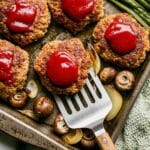 - Add the Veggies: After the initial 10 minutes, carefully remove the sheet pan from the oven. Arrange the seasoned green beans and mushrooms on the opposite side of the pan from the mini meatloaves. Top each mini meatloaf with 1 tablespoon of no-sugar-added ketchup to create a flavorful glaze.