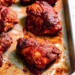 - Optional Broil for Crispy Skin: Preheat your oven broiler on high and line a baking sheet with foil. Using kitchen tongs, carefully transfer chicken thighs skin-side up onto the baking sheet. For extra sauciness, brush additional BBQ sauce on top. Place under the broiler for 4-5 minutes until skin turns crispy and caramelized. Watch closely to avoid burning.