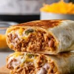 - Serve: Spoon the finished chicken burrito filling onto warmed tortillas and top with your choice of cheese, sour cream, salsa, and other desired toppings.