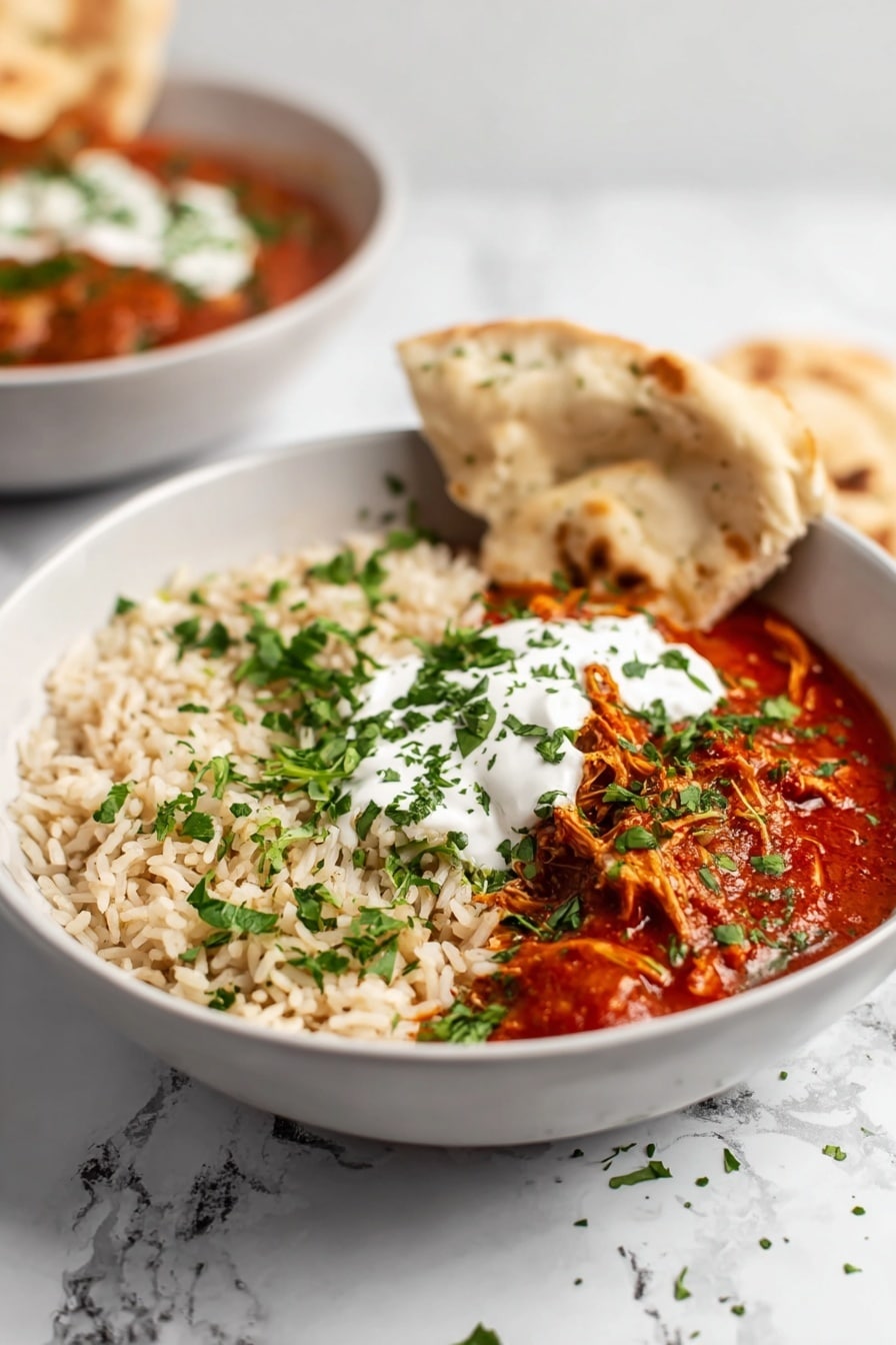 Serve your chicken tikka masala with brown rice, naan, or pita bread, and don’t skip on the optional garnishes like a dollop of Greek yogurt and fresh cilantro. These really lift the dish with a cool contrast to the warmly spiced sauce.