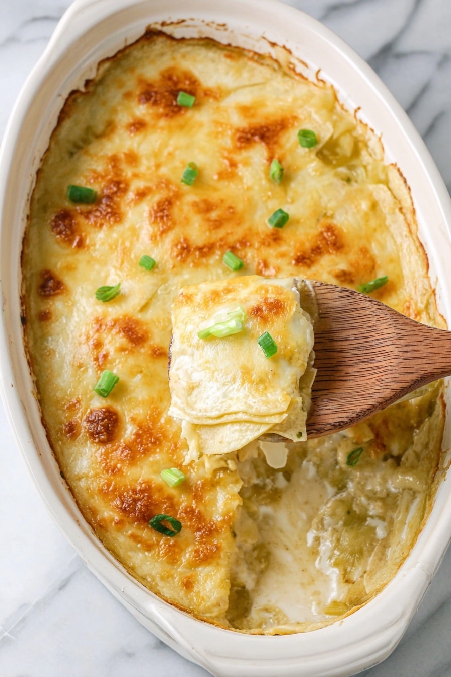 An oval white dish holds a baked layered casserole with a golden top layer of melted cheese and light brown crispy edges, garnished with small pieces of chopped green onions scattered on top. The dish sits on a table with a white marbled texture, next to a small white bowl filled with more chopped green onions, a wooden spoon, a white plate with two forks, and a green and white patterned cloth napkin. Photo taken with an iphone --ar 2:3 --v 7 - Slow Cooker Green Chicken Enchiladas, green chicken enchiladas, green enchiladas, easy chicken enchiladas, crockpot chicken recipes