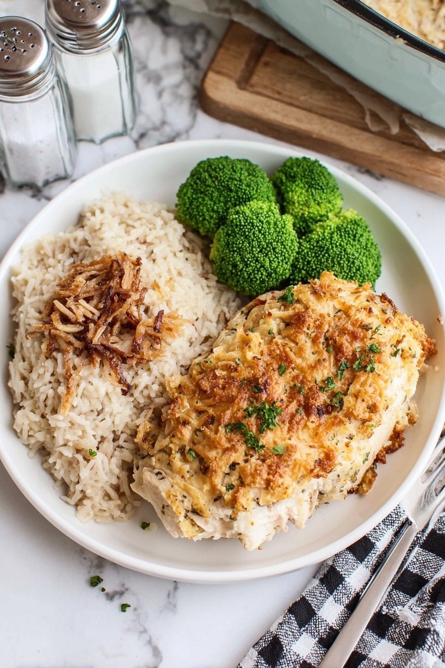 My favorite thing to serve alongside this Slow Cooker No Peek Chicken and Rice Recipe is steamed green beans or a crisp side salad for some crunch. Roasted Brussels sprouts or simple garlic bread can also round out the meal nicely without taking away from the creamy goodness.