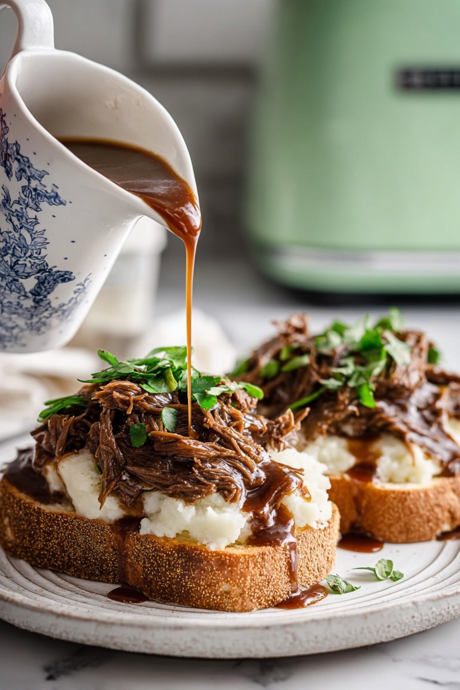 A hearty and comforting recipe for Hot Roast Beef Sandwiches cooked slowly to perfection in a slow cooker. Tender shredded beef is smothered in a savory brown gravy made from gravy mix packets, served over your choice of bread, and pairs wonderfully with creamy mashed potatoes. Ideal for an easy, make-ahead meal with minimal prep and maximum flavor.