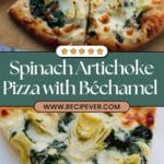 This Spinach Artichoke Pizza combines a crispy homemade-style crust with a creamy spinach béchamel sauce, fresh spinach, artichoke hearts, and a blend of provolone, mozzarella, and parmesan cheeses. Baked on a pizza stone for an evenly cooked golden crust, this pizza offers a delightful twist on classic flavors perfect for a savory and satisfying meal.