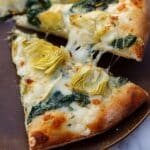 This Spinach Artichoke Pizza combines a crispy homemade-style crust with a creamy spinach béchamel sauce, fresh spinach, artichoke hearts, and a blend of provolone, mozzarella, and parmesan cheeses. Baked on a pizza stone for an evenly cooked golden crust, this pizza offers a delightful twist on classic flavors perfect for a savory and satisfying meal.
