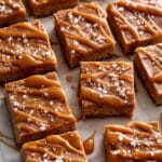 Use the parchment overhang to lift the blondies out of the pan and onto a cutting board. Then, drizzle your toffee sauce generously on top and finish with a sprinkle of flaky sea salt for that perfect sweet-salty contrast. When slicing, use a sharp knife wiped clean between cuts to get nice, clean squares that look as good as they taste.