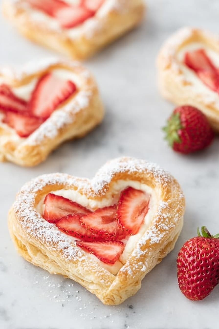 Delight in these charming Strawberry Danish Hearts—flaky puff pastry filled with a creamy vanilla-sweetened cream cheese and topped with fresh strawberries. Perfect for breakfast, brunch, or a sweet snack, these pastries are easy to prepare and bake to golden perfection with a crunchy sugar topping and a dusting of powdered sugar.