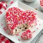 This Toffee Chocolate Chip Cheeseball is a delightful, creamy dessert featuring a rich blend of cream cheese, butter, and sugars mixed with sweet mini chocolate chips and crunchy Heath toffee bits. Perfect for parties or holiday gatherings, this no-bake treat is shaped into a festive heart and adorned with colorful sprinkles for an extra fun touch.