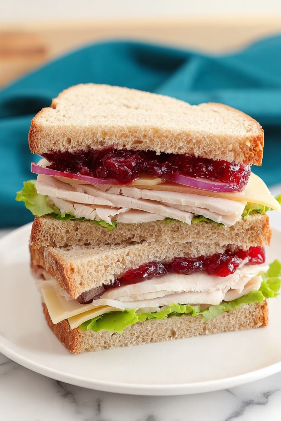 Since the sandwich is best served cold, I avoid reheating to preserve freshness. If you prefer warmed turkey, lightly heat the slices before assembling and add the cranberry sauce and veggies fresh to keep that vibrant flavor.