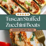 Delicious and healthy Tuscan Stuffed Zucchini Boats filled with a flavorful quinoa and chickpea mixture, sundried tomatoes, spinach, and marinara, topped with melted mozzarella and fresh basil. A perfect baked vegetarian meal that is both nutritious and satisfying.