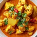 A flavorful and hearty Vegetarian Tofu Cashew Coconut Curry featuring a blend of aromatic spices, fresh vegetables, and creamy coconut milk, simmered to perfection with firm tofu and crunchy cashews for a satisfying and nourishing meal.
