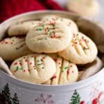 While I love the simplicity of sprinkles on these whipped shortbread cookies, sometimes I like to dust them lightly with extra powdered sugar just before serving for a snowy effect. You could also drizzle some melted chocolate or even dip half in white chocolate for a fancy touch. It’s your canvas—feel free to get creative!