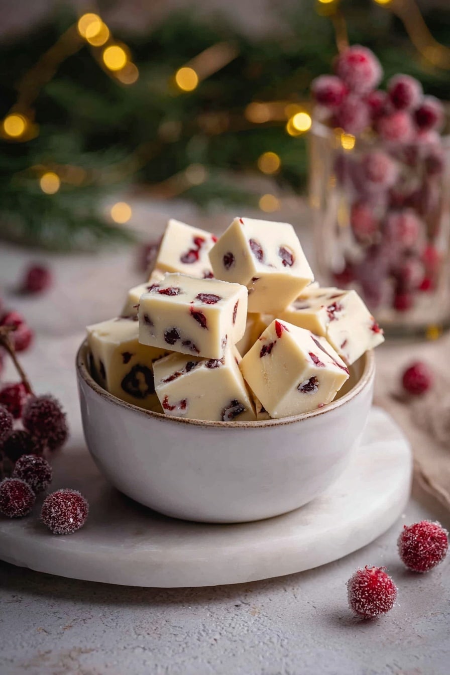 A small white bowl holds about twenty small square pieces of white fudge with dark red bits inside. The bowl sits on a white plate, both on a white marbled surface. In the soft background are dark green pine needles, red berries in a glass, and a string of yellow fairy lights, giving a warm festive feel. Some loose red berries are scattered lightly near the plate. photo taken with an iphone --ar 2:3 --v 7 - White Chocolate Cranberry Fudge, easy white chocolate fudge, cranberry holiday treats, quick fudge recipes, homemade holiday candies