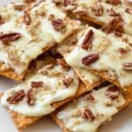 The image shows a close-up of square crackers layered on a white plate on a white marble surface. Each cracker is topped with a thick layer of white cream, piled generously in a swirled texture. Over the cream, small pieces of brown pecans are scattered, adding a rough and crunchy texture. A light caramel drizzle is spread unevenly across the top, adding a touch of shine and a warm amber color. The arrangement of crackers is close together, showing multiple pieces in the frame. photo taken with an iphone --ar 2:3 --v 7 - White Chocolate Pecan Toffee, White Chocolate Pecan Toffee Recipe, Easy Toffee with White Chocolate and Pecans, Salted Toffee Bars, Holiday Toffee Treats