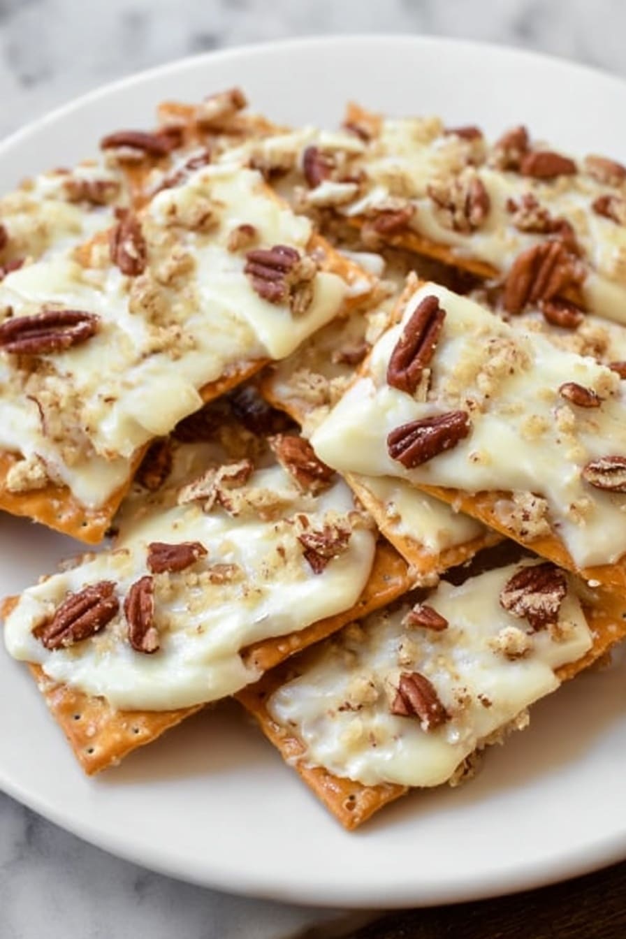 The dish shows several pieces of crispy crackers topped with a smooth white layer of frosting or icing, scattered with small pieces of brown pecans. The crackers are light golden brown, with the white frosting drizzled and spread over them unevenly. The pecan pieces add rough texture and a darker brown color on top. The crackers are arranged close together on a simple white plate, set against a white marbled surface. photo taken with an iphone --ar 2:3 --v 7 - White Chocolate Pecan Toffee, White Chocolate Pecan Toffee Recipe, Easy Toffee with White Chocolate and Pecans, Salted Toffee Bars, Holiday Toffee Treats