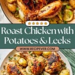 While I don’t freeze whole roasted chicken often, the leftover carved meat freezes well when wrapped tightly in foil or freezer bags. Potatoes and leeks tend to get softer upon thawing, so I recommend reheating gently or enjoying leftovers fresh.