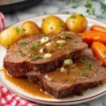 - Finish and Serve: Remove and discard the thyme sprigs. Shred the beef roast and serve alongside the cooked vegetables, spooning the flavorful gravy from the slow cooker over the top. Enjoy your hearty meal!